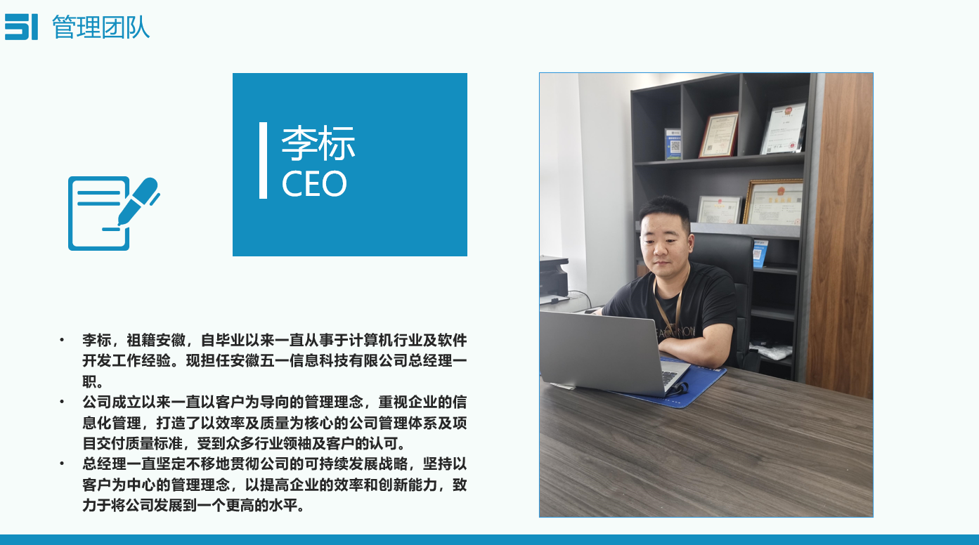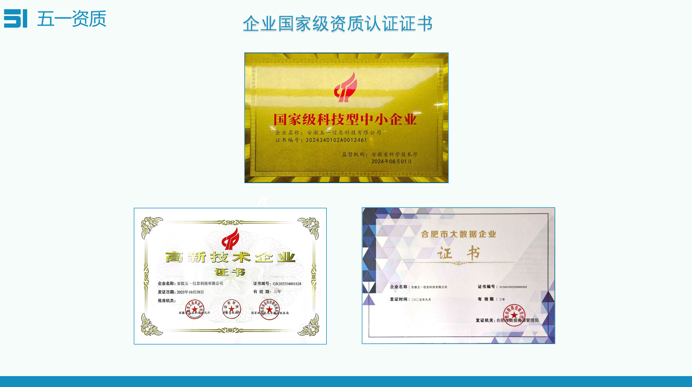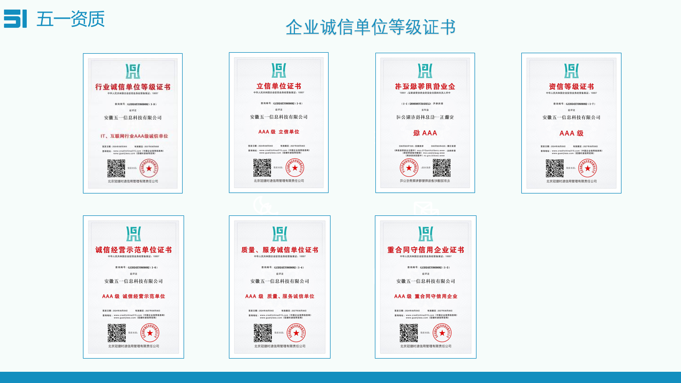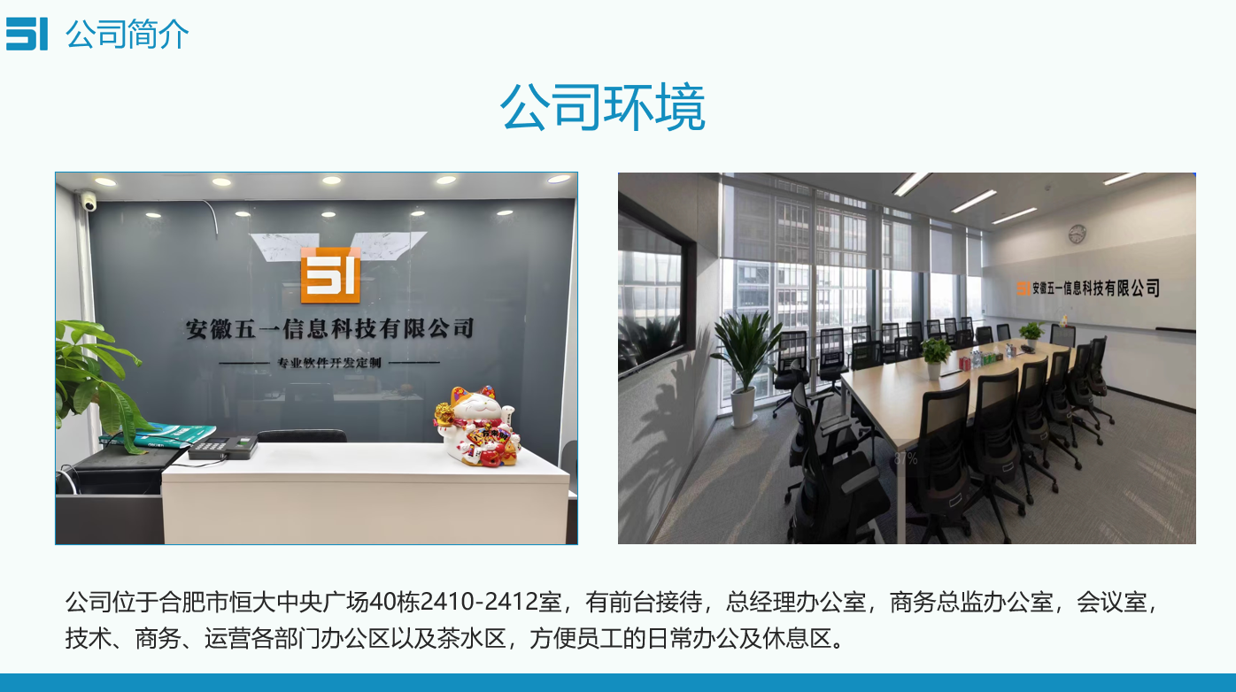 安徽五一信息科技有限公司成立于2014年,是安徽合肥一家专业从事软件开发、软件定制、软件实施的公司。公司是国家级高新技术企业,国家科技型中小企业,大数据企业,拥有二十几项软件著作权。同时 拥有一批长期专业从事软件开发、软件定制的专业人才,具有雄厚的技术开发实力,全方位满足政府与企业信息化需求。