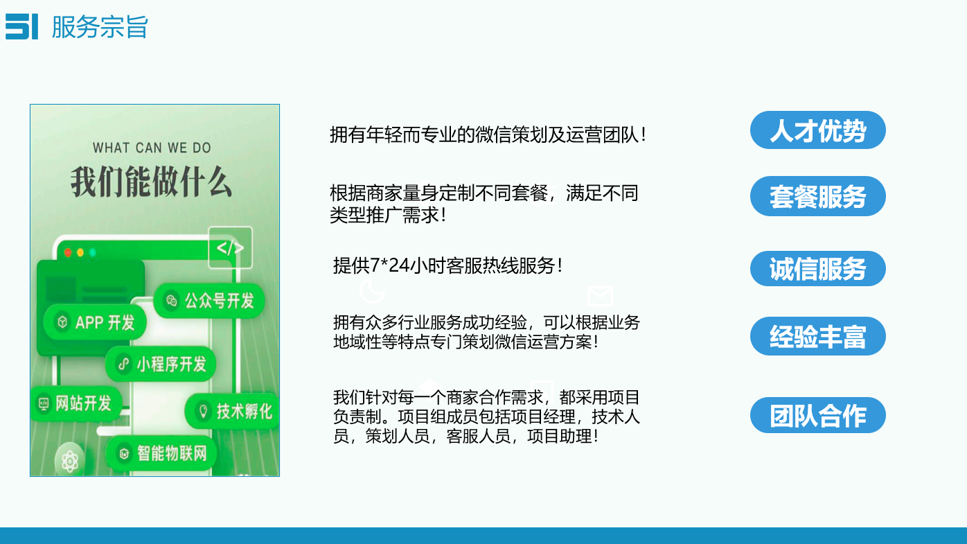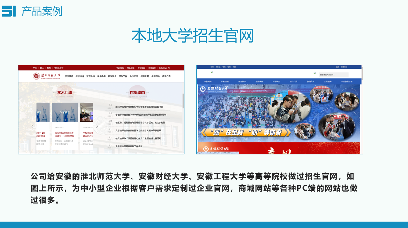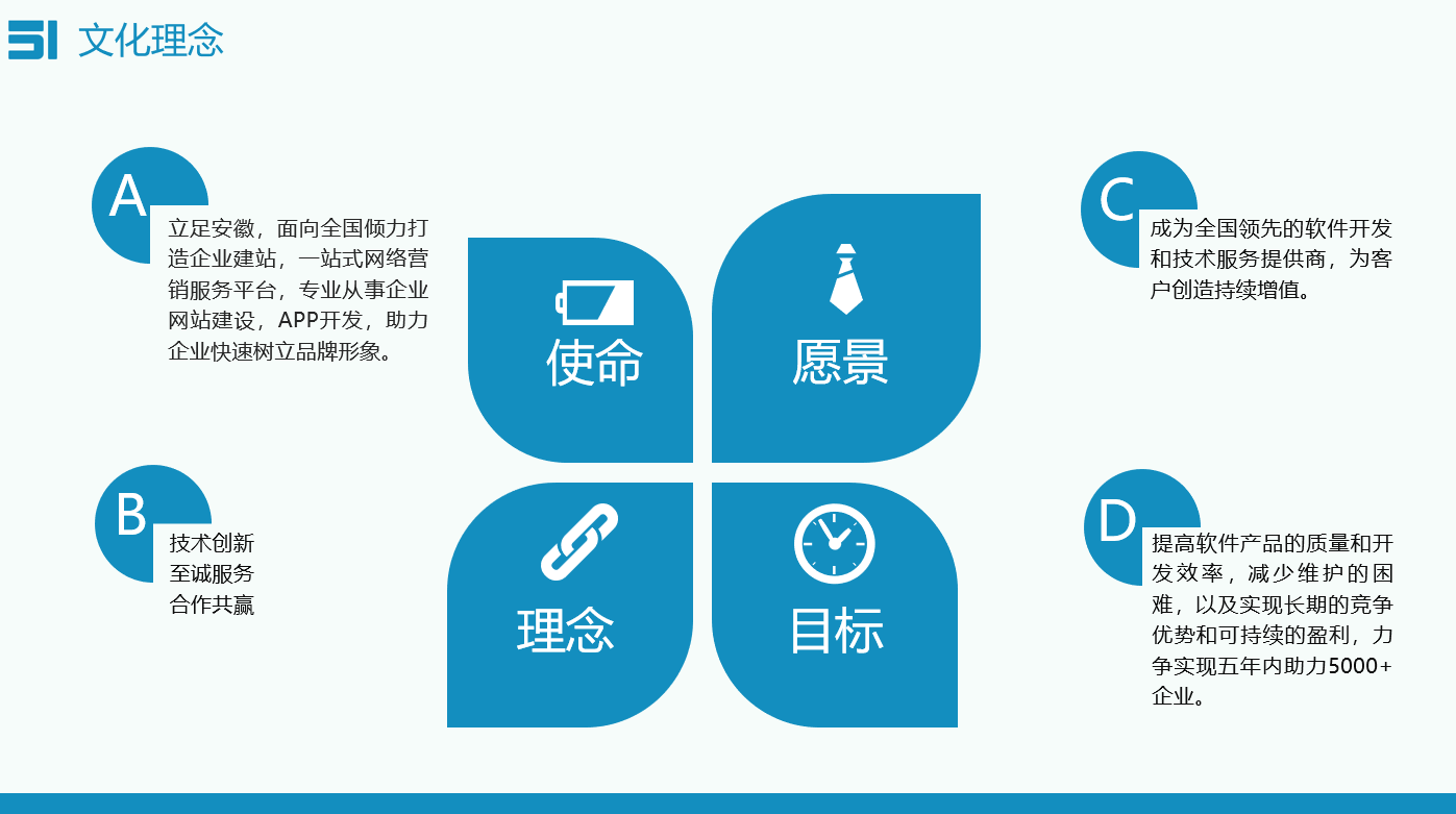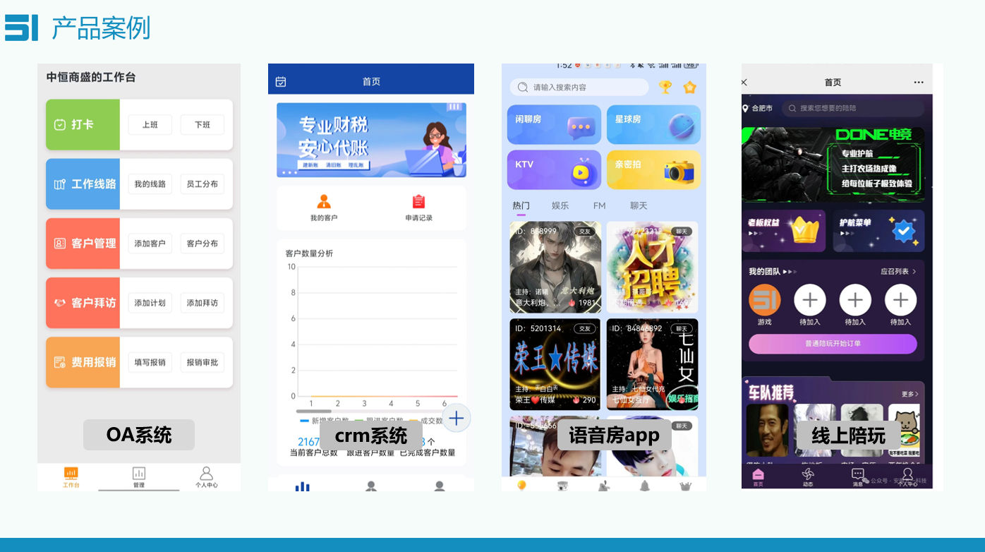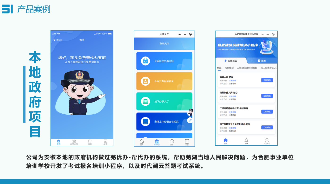 经过十年的精耕细作,公司的服务内容不断丰富,服务质量不断提升。目前,公司业务范围涵盖了行业软件定制,小程序,APP开发,网站建设,金融软件,直播软件,聊天IM,CRM,OA,ERP系统,政府软件,高等院校官网等多项业务模块。服务范围覆盖了安徽省及全国部分地区,已经成功为众多企业提供了专业服务,与百余家企业建立了长期战略合作伙伴关系。企以才立,业以才兴。企业始终将以人为本的理念贯穿发展始终,广纳四海贤良,创造优良工作环境,提供广阔成长空间。